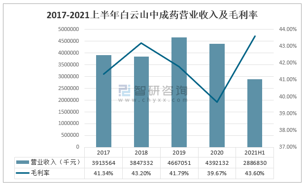 白云山是全國最大的制藥企業集團之一。其中2021上半年白云山中成藥營業收入為2886830千元,毛利率為43.6%。