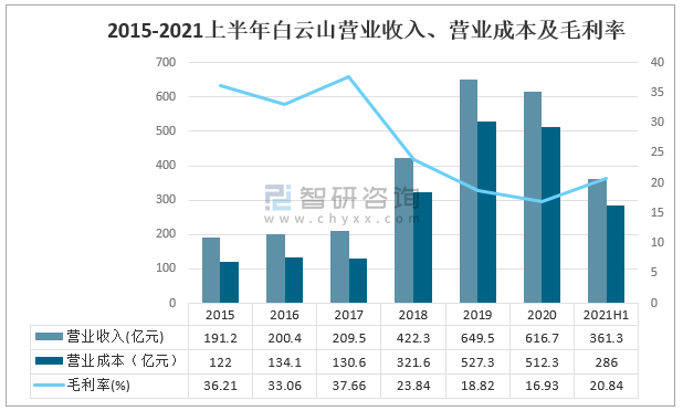 廣州白云山醫藥集團股份有限公司是廣州醫藥集團有限公司控股的上市公司,主要從事中有中西成藥、化學原料藥、天然藥物、生物醫藥、化學原料藥中間體的研究開發、制造與銷售。2021上半年白云山營業收入為361.3億元;白云山營業成本為286億元;白云山毛利率為20.84%。