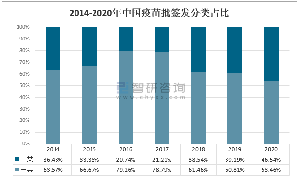 智研咨詢發布的《2021-2027年中國疫苗行業市場運行格局及發展規模預測報告》數據顯示:中國預防接種的疫苗分為兩類。第一類疫苗,是指政府免費向公民提供,公民應當依照政府的規定受種的疫苗,包括國家免疫規劃確定的疫苗,省、自治區、直轄市人民政府在執行國家免疫規劃時增加的疫苗,以及縣級以上人民政府或者其衛生主管部門組織的應急接種或者群體性預防接種所使用的疫苗;第二類疫苗,是指由公民自費并且自愿受種的其他疫苗。其中2020年中國疫苗批簽分類中,一類疫苗占比53.46%;二類疫苗占比46.54%。