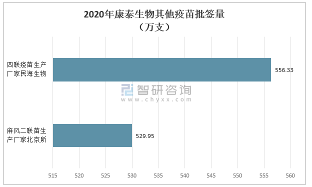 其中2020年康泰生物四聯疫苗中,民海生物生產廠家批簽數量為556.33萬支;麻風二聯苗生產廠家北京所批簽量為529.95萬支。