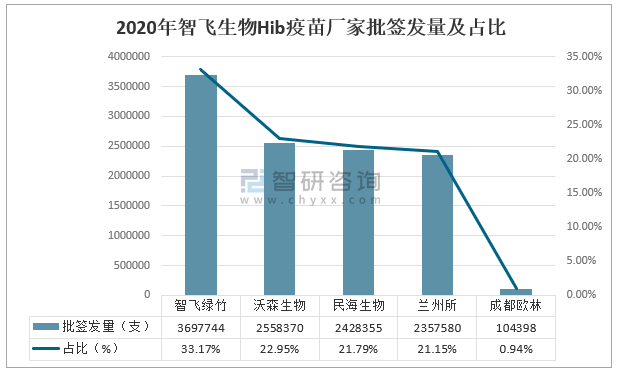 2020年智飛生物Hib疫苗廠家批簽發量及占比