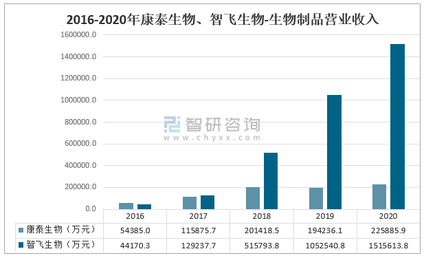 2016-2020年康泰生物、智飛生物-生物制品營業收入