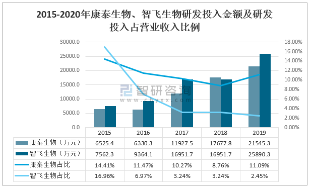 2015-2020年康泰生物、智飛生物研發投入金額及研發投入占營業收入比例