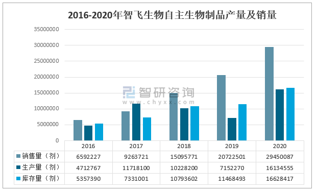 2016-2020年智飛生物自主生物制品產量及銷量