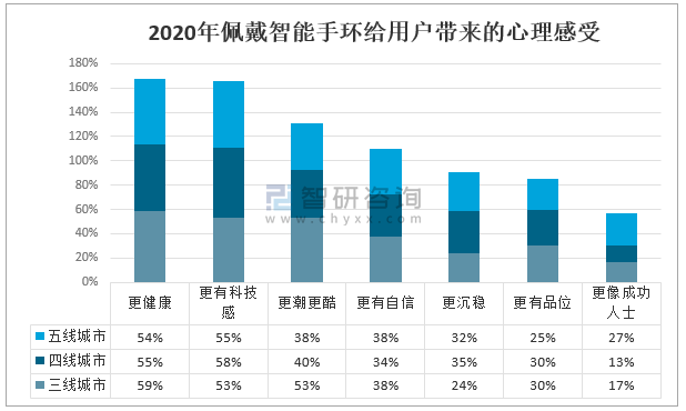 數據顯示:佩戴智能手環能夠給用戶帶來健康、科技、自信有品位的良好感受。另外,智能手環給五線城市消費者帶來的沉穩、成功人士感受高于三四線。