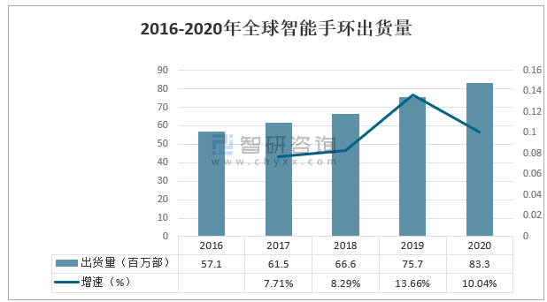 2016-2020年全球智能手環出貨量持續增長,但2020年受疫情影響,全球智能手環出貨量增速較2019年出現下滑,增速從2019年的13.66%下降到2020年的10.04%。隨著疫情的恢復,智能手環出貨量增速有望提高。