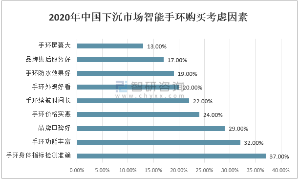 2020年中國下沉市場購買智能手環最主要的考慮因素是手環檢測身體指標的準確性,占比37%。其次的考慮因素是手環的功能和口碑,占比分比為32%和29%。