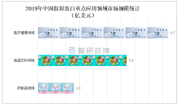 智研咨詢發布的《2021-2027年中國膠原蛋白產業發展態勢及競爭格局預測報告》數據顯示:從重點應用領域來看,2019年中國膠原蛋白醫療健康領域市場規模為4.7億美元;食品飲料領域市場規模為3.2億美元;護膚品領域市場規模為1.3億美元。