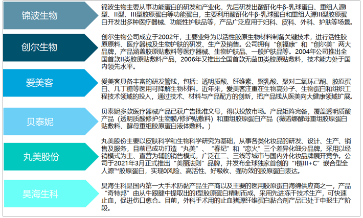 中國膠原蛋白市場上市企業主要有錦波生物、創爾生物、愛美客、貝泰妮、丸美股份、昊海生科等。錦波生物主要從事功能蛋白的研發和產業化,先后研發出酸酐化牛β-乳球蛋白、重組人源I型、II型、III型膠原蛋白等功能蛋白,主要利用酸酐化牛β-乳球蛋白和重組人源III型膠原蛋白開發出多種醫療器械、功能性護膚品等,產品廣泛應用于婦科、皮科、外科、護膚等場景。創爾生物公司成立于2002年,主要業務為以活性膠原生物材料制備關鍵技術,進行活性膠原原料、醫療器械及生物護膚的研發、生產及銷售。公司擁有“創???rdquo;和“創爾美”兩大品牌,產品涵蓋膠原貼敷料等醫療器械、生物護膚品、一般護膚品等。2004年公司推出全國首款II類膠原貼敷料產品,2006年又推出全國首款無菌Ⅲ類膠原貼敷料,技術能力處于國內領先水平。