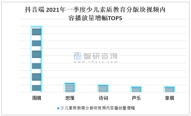 從播放量增幅上來看,2021Q1素質教育分版塊的TOP5中包含了圍棋、思維、詩詞、聲樂、象棋等偏小眾品類。其中圍棋增幅較其它品類更是遙遙領先。