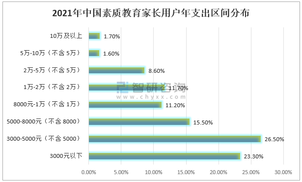 2021年中國素質教育家長用戶年支出區間分布