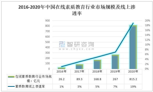 2016-2020年中國在線素質教育行業市場規模及線上滲透率