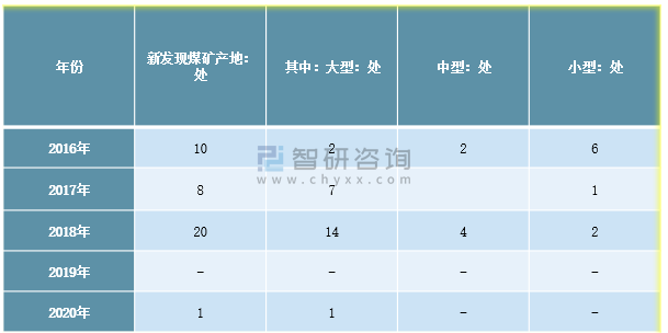 2016-2020年中國新發(fā)現(xiàn)煤礦產(chǎn)地情況