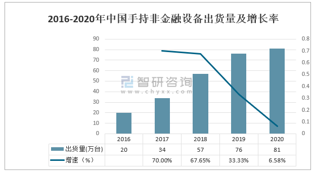 2016-2020年中國手持非金融設備出貨量及增長率