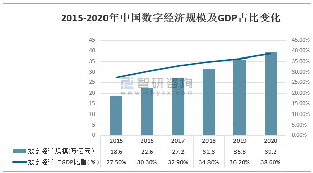 2015-2020年中國數字經濟規模及GDP占比變化