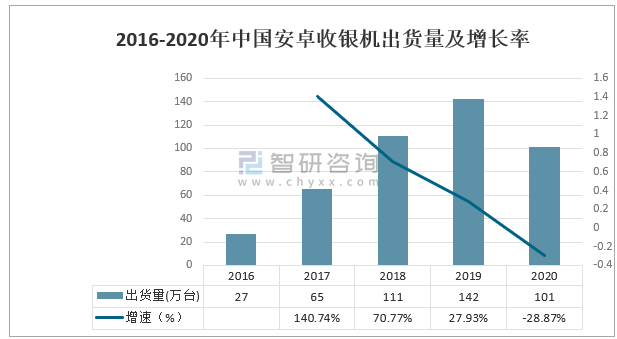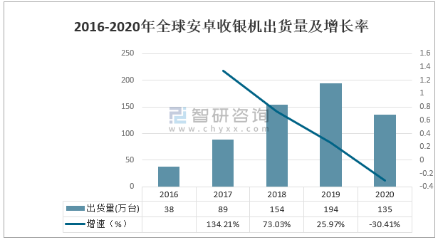 2016-2020年全球安卓收銀機出貨量及增長率