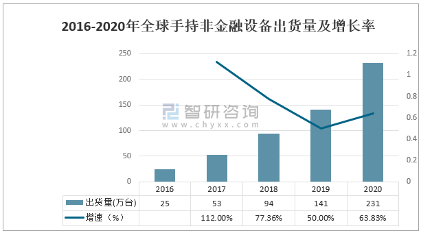 2016-2020年全球手持非金融設備出貨量及增長率