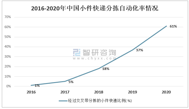 2016-2020年中國小件快遞分揀自動化率情況