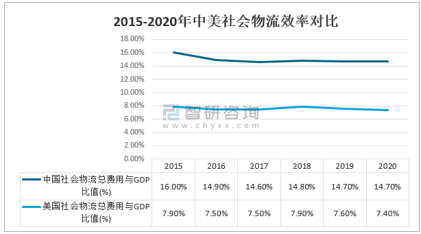 2015-2020年中美社會物流效率對比