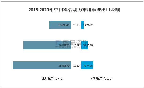 據中國海關數據,2020年中國混合動力乘用車進口金額為3548679萬元,同比增長21.6%;混合動力乘用車出口金額為717406萬元,同比增長81.5%。