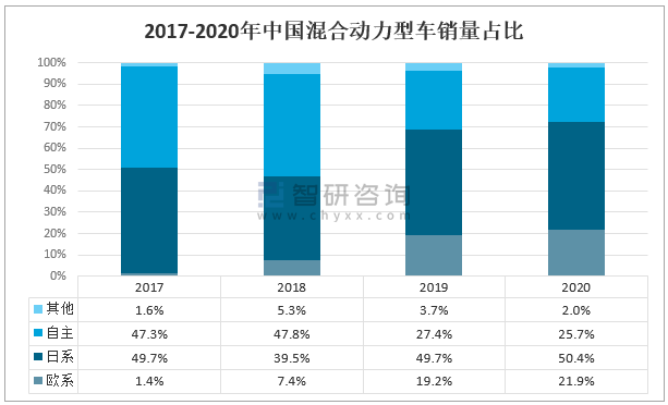 其中2020年中國混合動力車型銷量中,歐系混合動力車銷量占比21.9%;日系混合動力車型銷量占比50.4%;自主混合動力車銷量占比25.7%。