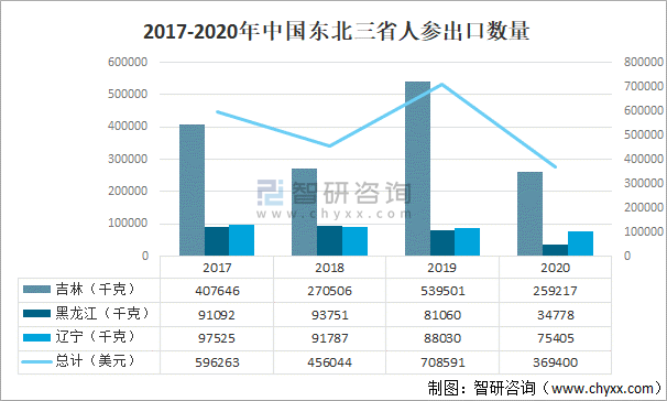 中國在全球人參貿易中占據十分重要的地位。以下東北三省人參均統計于121120代碼。2020年東北三省人參出口數量為369400千克,其中吉林人參出口數量為251433千克,同比下降53.4%;黑龍江人參出口數量為34778千克,同比下降57.1%;遼寧人參出口數量為83189千克,同比下降5.5%。