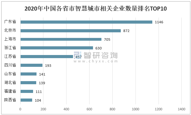 2020年中國各省市智慧城市相關(guān)企業(yè)數(shù)量排名TOP10