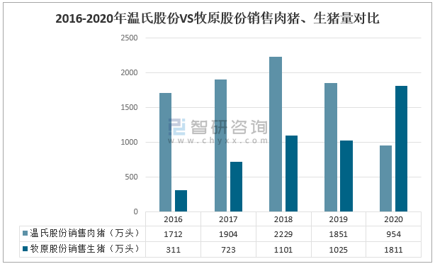 2016-2020年溫氏股份VS牧原股份銷售肉豬、生豬量對比