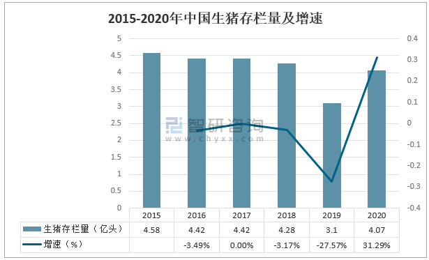 全國各地積極落實生豬穩產保供各項政策措施,新建、擴建養殖場陸續建成投產,生豬存欄持續較快恢復。2020年,中國生豬存欄量4.07億頭,較上年增加0.97億頭,同比增長31.29%,恢復到2017年末的92.1%。