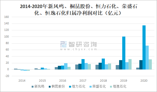 2014-2020年新鳳鳴、桐昆股份、恒力石化、榮盛石化、恒逸石化歸屬凈利潤對比(億元)