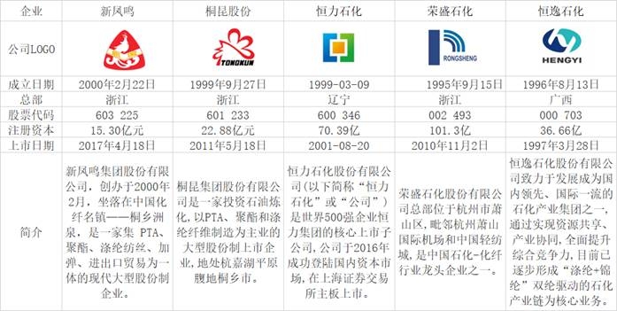 新鳳鳴、桐昆股份、恒力石化、榮盛石化、恒逸石化基本情況對比