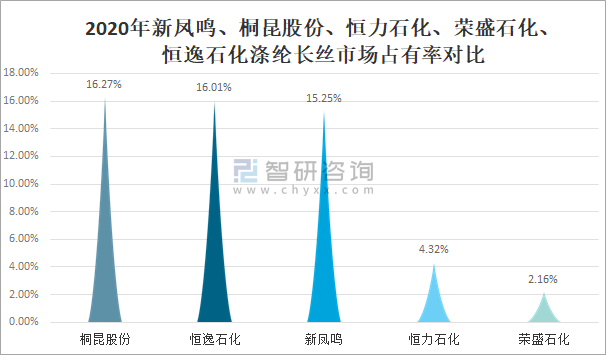 2020年新鳳鳴、桐昆股份、恒力石化、榮盛石化、恒逸石化滌綸長絲市場占有率對比