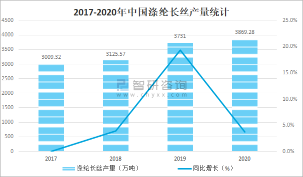 智研咨詢發布的《2021-2027年中國滌綸長絲行業市場供需模式及競爭戰略分析報告》數據顯示:在產能迅速增長的同時,伴隨著品種優化,滌綸品種從最初的以短纖為主發展到以長絲為主,裝飾用、產業用比例也正在逐步擴大,2020年中國滌綸長絲產量達3869.28萬噸,較2019年增加了138.28萬噸,同比增長3.7%。