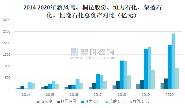 2014-2020年新鳳鳴、桐昆股份、恒力石化、榮盛石化、恒逸石化總資產對比(億元)