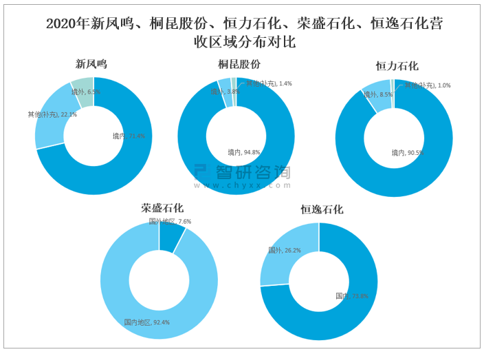 2020年新鳳鳴、桐昆股份、恒力石化、榮盛石化、恒逸石化營收區域分布對比