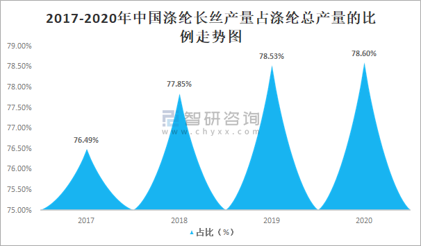 中國滌綸長絲產量占滌綸總產量的比例逐年攀升,2020年中國滌綸長絲產量占滌綸總產量的78.60%,較2017年的76.49%增長了2.11%。