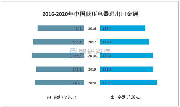 2016-2020年中國(guó)低壓電器進(jìn)出口金額