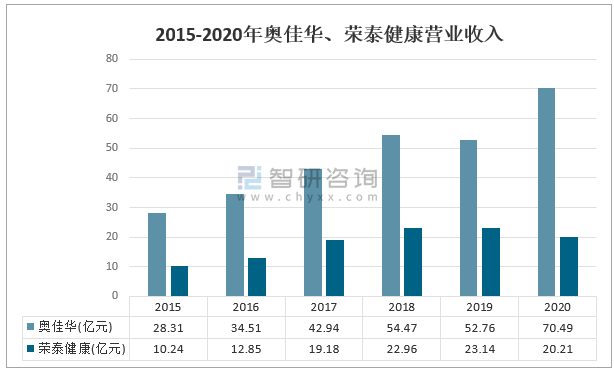 智研咨詢發布的《2021-2027年中國按摩器行業市場全景調查及投資潛力研究報告》數據顯示:上海榮泰健康科技股份有限公司成立于2002年,品牌創立于1997年。2020年榮泰健康營業收入為20.21億元,同比下降12.7%;奧佳華智能健康科技集團股份有限公司是中國領先的集品牌、營銷、研發、制造、服務為一體的國際化智能健康產業集團,是國內按摩器具行業產業鏈完整并在全球具有影響力的企業,2020年奧佳華營業收入為70.49億元,同比增長33.6%。