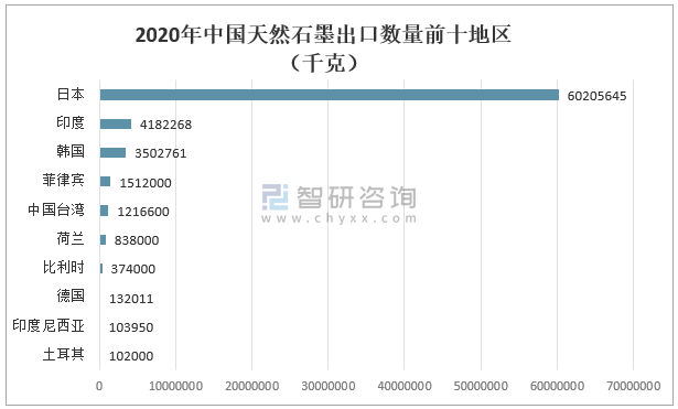 其中2020年中國天然石墨出口數量最多地區為日本60205645千克,其次是出口至印度天然石墨數量為4182268千克。