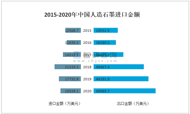 據中國海關數據,2020年中國人造石墨進口金額為16539.1萬美元,同比下降6.7%;中國人造石墨出口金額為49989.7萬美元,同比增長13.1%。