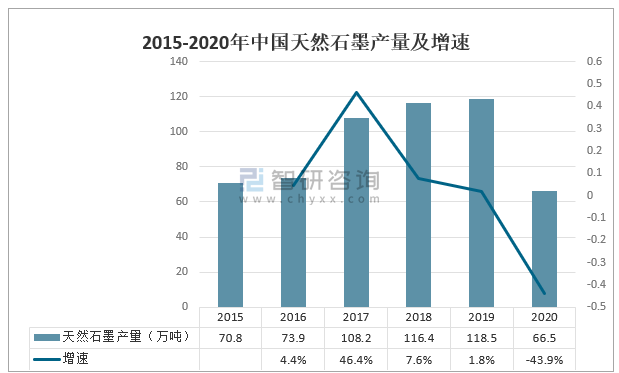2015-2020年中國天然石墨產量及增速