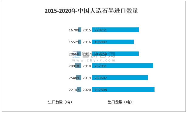 人造石墨是晶體發育程度取決于原材料及熱處理溫度。一般來說,熱處理溫度越高,其石墨化程度也就越高。工業生產的人造石墨,其石墨化程度通常低于90%。2020年中國人造石墨出口數量為292808噸,同比增長11.1%;中國人造石墨進口數量為22147噸,同比下降13.1%。