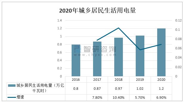 2020年,城鄉居民生活用電量1.2萬億千瓦時,同比增長6.9%,增速比上年提高1.2個百分點。分季度看,各季度增速分別為3.5%、10.6%、5.0%、10.0%。分城鄉看,城鎮居民用電量同比增長5.5%,鄉村居民用電量增長8.7%。