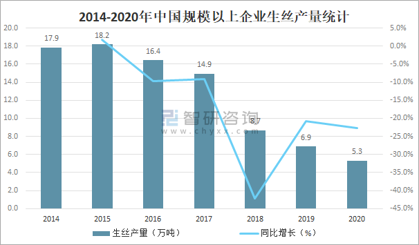 中國生絲有悠久的歷史,現(xiàn)代的產(chǎn)量占世界首位,但自2016年起中國生絲產(chǎn)量開始逐年下滑,2020年中國規(guī)模以上企業(yè)生絲產(chǎn)量為5.3萬噸,較2019年減少了1.56萬噸,同比減少22.7%。