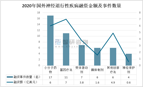 2020年,國外神經退行性疾病的投融資熱度進一步上升,全年發生51起融資事件,累積融資額23.79億美元;其中,小分子藥物融資事件數量17起,融資金額6.0億美元;基因療法融資事件數量11起,融資金額7.0億美元;受體激動劑融資事件數量7起,融資金額3.8億美元。