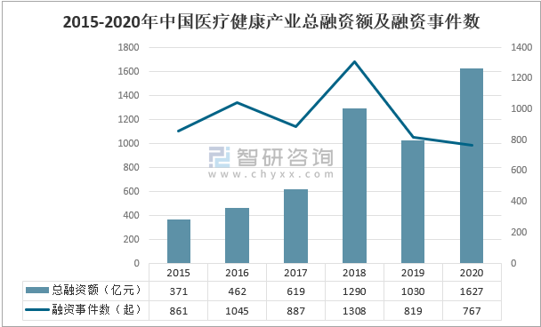 2020年,中國醫療健康產業投融資總額達到1627億元,較上年增加597億元,同比增長58%,創下歷史新高;融資交易僅767起,較上年減少52起,同比下滑6%。2020年上半年新冠疫情導致短期資金收緊,我國醫療健康融資項目大幅下降,在下半年涌入醫療健康產業的資金則出現超強反彈,使得全年融資總額飆升至歷史首位。