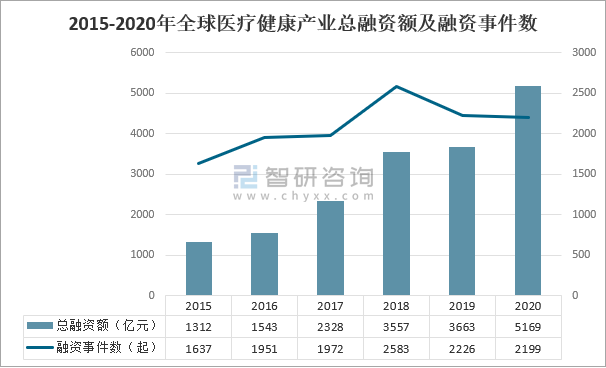 智研咨詢發布的《2021-2027年中國健康醫療行業市場經營管理及投資前景預測報告》數據顯示:2020年,全球醫療健康產業融資總額達5169億元,較上年增加1506億元,同比增長41%,創新歷史新高;但融資事件卻輕微下滑,自2018年起連續兩年下跌,2020年全球醫療健康產業共發生2199起融資事件。