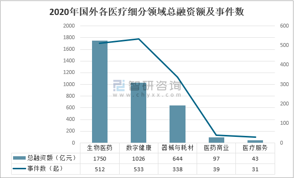 2020年全球醫療健康產業細分領域總融資額及事件數