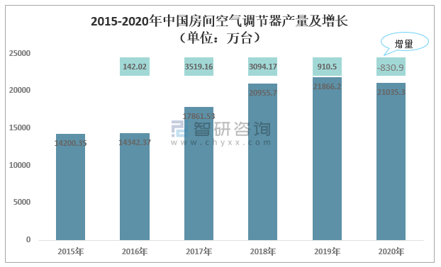 2015-2020年中國房間空氣調(diào)節(jié)器產(chǎn)量及增長