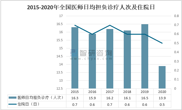 2015-2020年全國醫(yī)師日均擔(dān)負(fù)診療人次及住院日